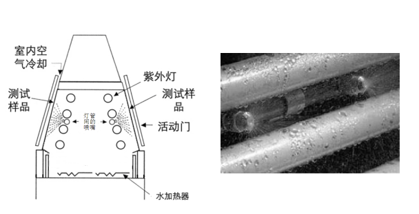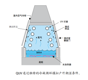 QUV冷凝系统实质上是蒸发的水蒸汽被实验箱的样板限制在实验箱内,样板背面的空气使样板温度水蒸汽温度低一些,这个温差使得水蒸汽在样板上凝聚。冷凝循环期间,水通过水盘下的加热元件加热,水蒸汽充满试验箱,在100%湿度时达到平衡,水蒸汽连续在样品上凝结,而它们通过其背面的室内空气保持低温。在样品上凝结蒸汽,最后流回到水盘里。