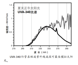 a) UVA-340: 能发出从315nm到400nm间的太阳光的波长,它的辐射峰值是在340nm处。UVA-340对不同试验的对照测试尤其有用,在短波紫外线波段可最佳模拟太阳光。